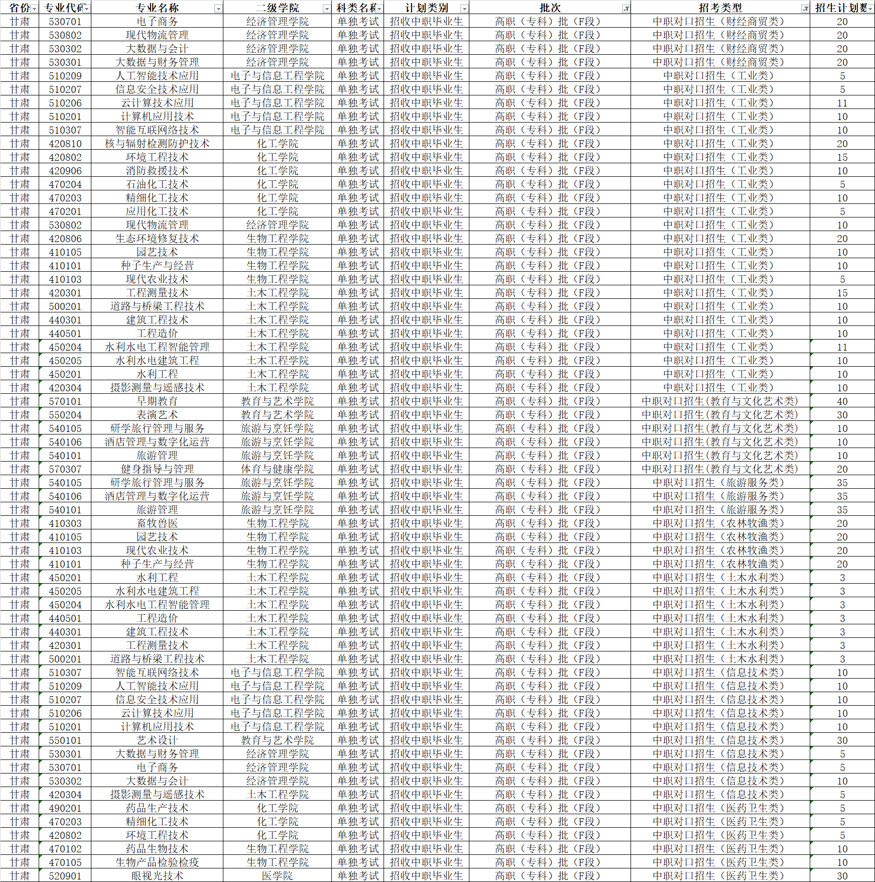 酒泉职业技术学院2024年中职对口升学考试招生专业及计划